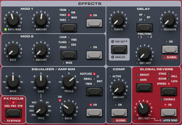 Enfin comme pour le Nord Stage 4, le Nord Piano 6 et le Nord Grand 2 chaque module de son dispose maintenant de sa propre section d'effet indépendante avec une reverbe commune.