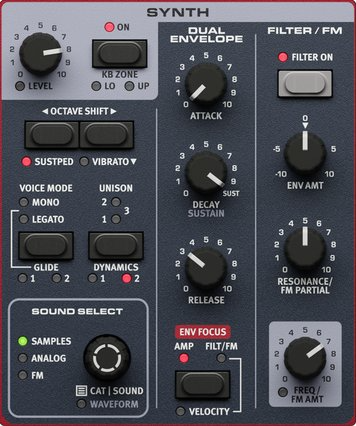 Nouvelle section synthé éditable avec lecture d'échantillons, formes d'ondes analogiques, et synthèse FM. Ce synthé bénéficie également d'un filtre passe bas avec résonance et d'une enveloppe de filtre et d'amplitude.